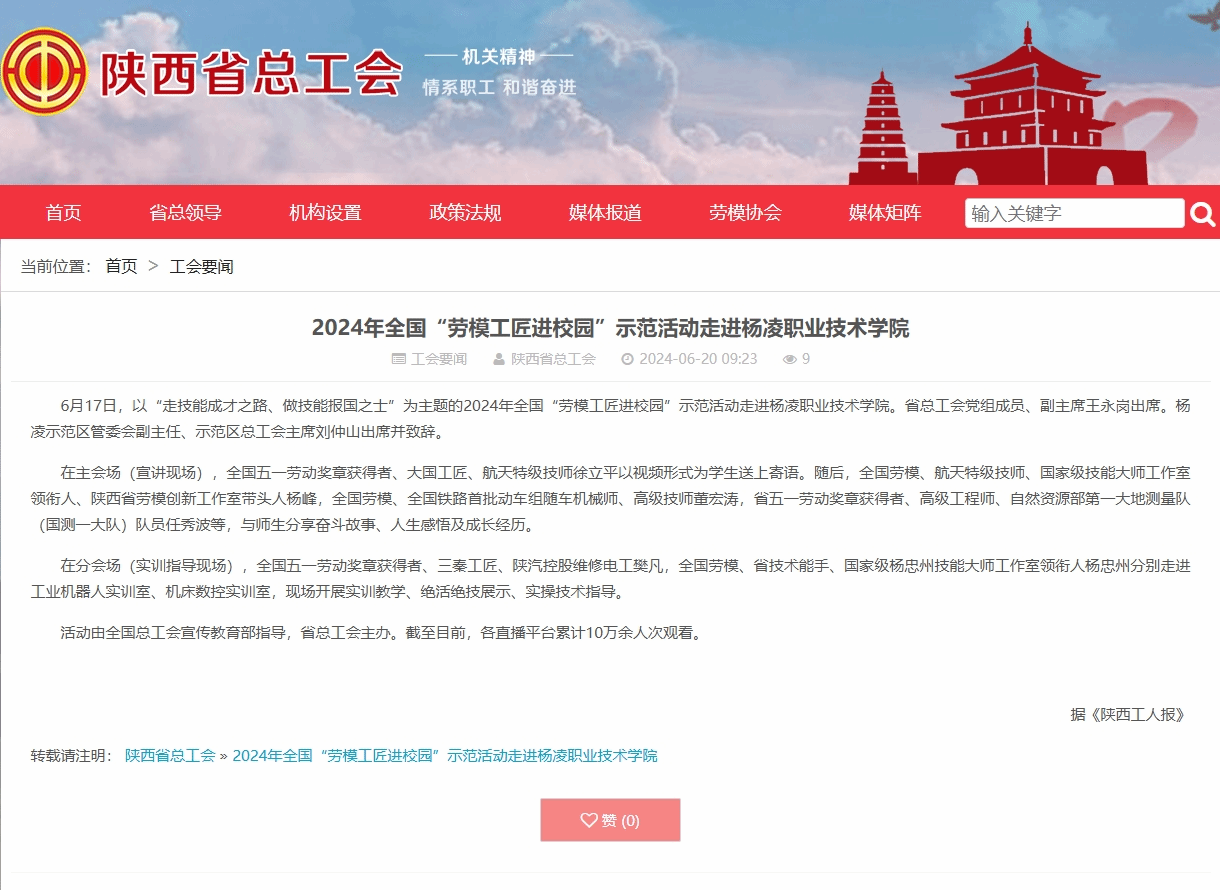 6月17日,以“走技能成才之路、做技能报国之士”为主题的2024年全国“劳模工匠进校园”示范活动走进杨凌职业技术学院。省总工会党组成员、副主席王永岗出席。杨凌示范区管委会副主任、示范区总工会主席刘仲山出席并致辞。