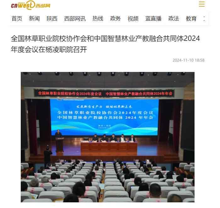 2024年11月8日至9日,由国家林业和草原局林草职业教育研究中心、中国林业教育学会职业教育分会主办,杨凌职业学院承办的全国林草职业院校协作会2024年度会议暨新质生产力赋能现代林草行业高质量发展研讨会、中国智慧林业产教融合共同体2024年年会暨新质生产力赋能智慧林业人才培养高质量发展研讨会在杨凌职业技术学院召开。本次年会的主题为“加快发展林草行业新质生产力,扎实推进林草职业教育高质量发展”。