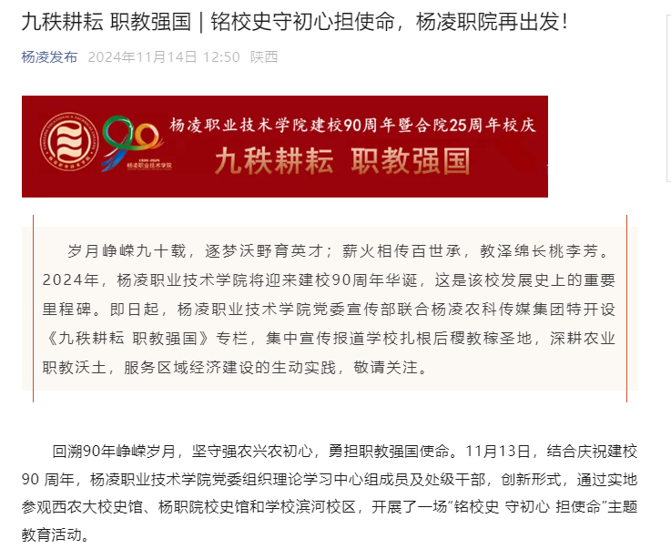 回溯90年峥嵘岁月,坚守强农兴农初心,勇担职教强国使命。11月13日,结合庆祝建校 90 周年,杨凌职业技术学院党委组织理论学习中心组成员及处级干部,创新形式,通过实地参观西农大校史馆、杨职院校史馆和学校滨河校区,开展了一场“铭校史 守初心 担使命”主题教育活动。