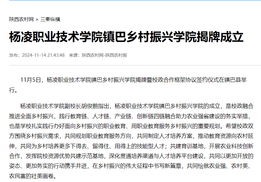 【陕西农村网】杨凌职业技术学院镇巴乡村振兴学院揭牌成立