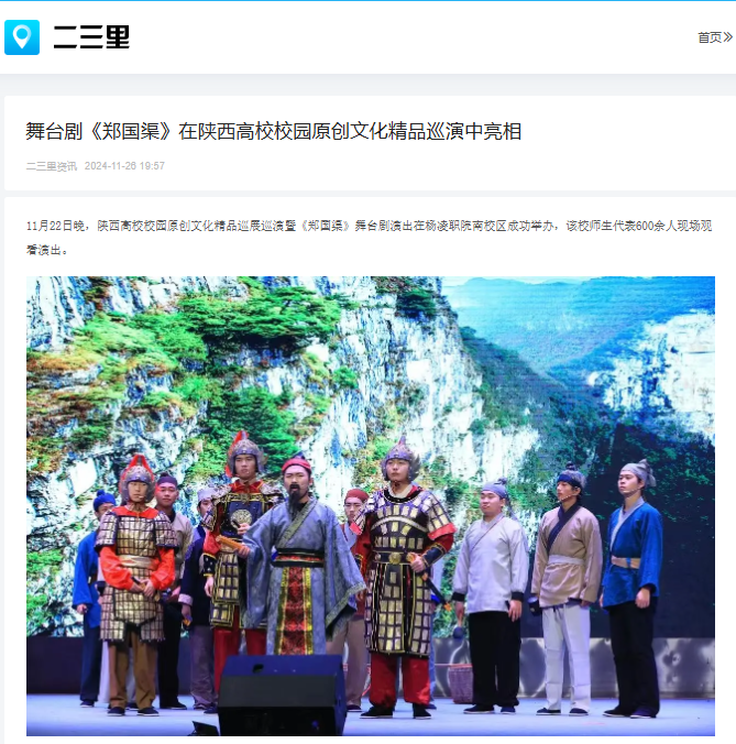 11月22日晚,陕西高校校园原创文化精品巡展巡演暨《郑国渠》舞台剧演出在杨凌职院南校区成功举办,该校师生代表600余人现场观看演出。