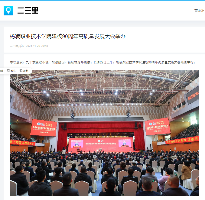 学农爱农,九十载弦歌不辍;职教强国,新征程芳华赓续。11月29日上午,杨凌职业技术学院建校90周年高质量发展大会隆重举行。