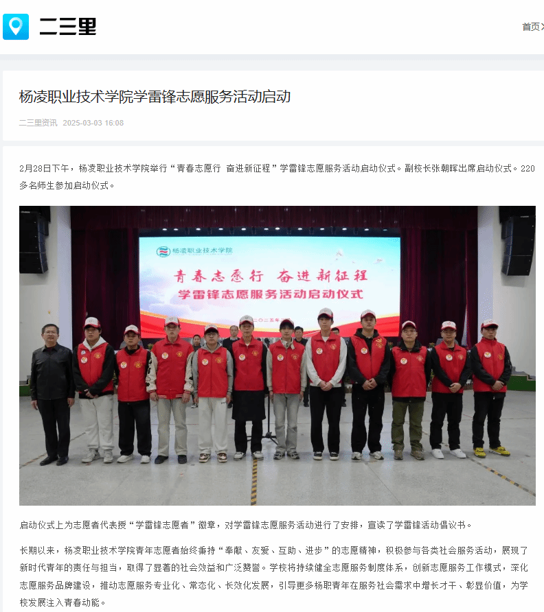 2月28日下午,杨凌职业技术学院举行“青春志愿行 奋进新征程”学雷锋志愿服务活动启动仪式。副校长张朝晖出席启动仪式。220多名师生参加启动仪式。