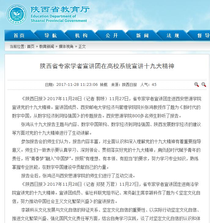 【陕西省教育厅网】陕西省专家学者宣讲团在高校系统宣讲党的十九大精神
