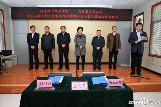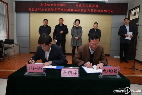 在旬邑县职业农民培育学院挂牌暨县校扶贫合作签字仪式上,任得元与张勇代表双方签订了《关于加强产学研结合促进经济发展的合作协议书》,李晓静与王周锁共同为杨凌职院旬邑县职业农民培育学院揭牌。