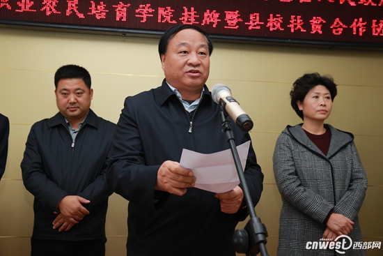 他表示,今天,学院与旬邑县政府签订校县扶贫合作协议,举行职业农民培育学院揭牌仪式,是贯彻落实党的十九大精神最有力的实践,是扶志和扶智机制、责任、义务的固化和承诺,是校县合作从松散合作走向紧密合作、自发服务走向制度化、规范化、可持续化的巩固和发展。学院相关部门要积极对接旬邑县的产业发展需求,健全工作运行机制,制定工作计划和目标,和旬邑县人民政府、县统战部门携手并肩,为“让贫困人口和贫困地区同全国一道进入全面小康社会”做出新的、更大的贡献。