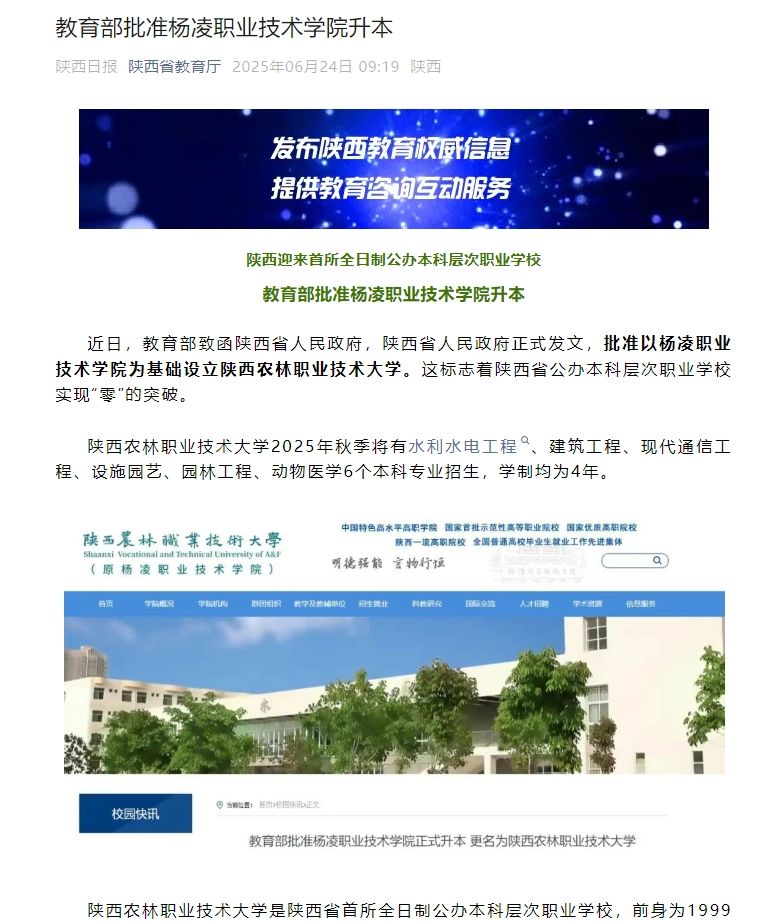 近日,教育部致函陕西省人民政府,陕西省人民政府正式发文,批准以杨凌职业技术学院为基础设立beat365官方网站。这标志着陕西省公办本科层次职业学校实现“零”的突破。