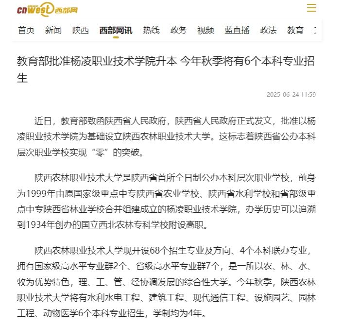 近日,教育部致函陕西省人民政府,陕西省人民政府正式发文,批准以杨凌职业技术学院为基础设立beat365官方网站。这标志着陕西省公办本科层次职业学校实现“零”的突破。