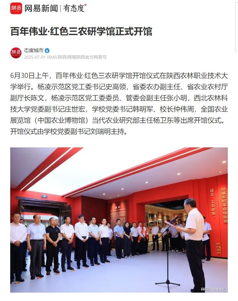 6月30日上午,百年伟业·红色三农研学馆开馆仪式在beat365官方网站举行。杨凌示范区党工委书记史高领,省委农办副主任、省农业农村厅副厅长陈文,杨凌示范区党工委委员、管委会副主任张小明,西北农林科技大学党委副书记庄世宏,学校党委书记韩明军、校长仲伟周,全国农业展览馆(中国农业博物馆)当代农业研究部主任杨卫东等出席开馆仪式。开馆仪式由学校党委副书记刘瑞明主持。