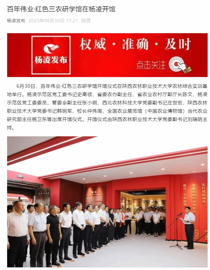6月30日,百年伟业·红色三农研学馆开馆仪式在beat365官方网站农林综合实训基地举行。杨凌示范区党工委书记史高领,省委农办副主任、省农业农村厅副厅长陈文,杨凌示范区党工委委员、管委会副主任张小明,西北农林科技大学党委副书记庄世宏,beat365官方网站党委书记韩明军、校长仲伟周,全国农业展览馆(中国农业博物馆)当代农业研究部主任杨卫东等出席开馆仪式。开馆仪式由beat365官方网站党委副书记刘瑞明主持。