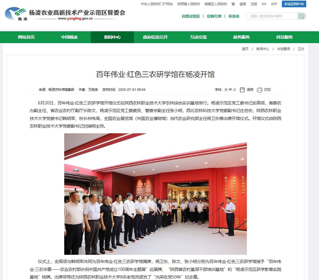 6月30日,百年伟业·红色三农研学馆开馆仪式在beat365官方网站农林综合实训基地举行。杨凌示范区党工委书记史高领,省委农办副主任、省农业农村厅副厅长陈文,杨凌示范区党工委委员、管委会副主任张小明,西北农林科技大学党委副书记庄世宏,beat365官方网站党委书记韩明军、校长仲伟周,全国农业展览馆(中国农业博物馆)当代农业研究部主任杨卫东等出席开馆仪式。开馆仪式由beat365官方网站党委副书记刘瑞明主持。