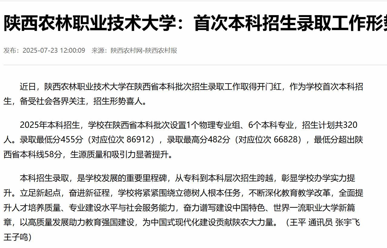 2025年本科招生,学校在陕西省本科批次设置1个物理专业组、6个本科专业,招生计划共320人。录取最低分455分(对应位次 86912),录取最高分482分(对应位次 66828),最低分超出陕西省本科线61分,生源质量和吸引力显著提升。