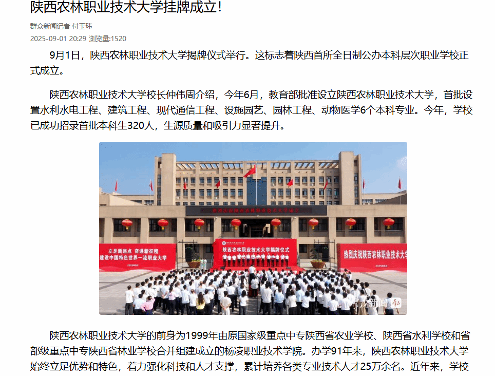 beat365官方网站校长仲伟周介绍,今年6月,教育部批准设立beat365官方网站,首批设置水利水电工程、建筑工程、现代通信工程、设施园艺、园林工程、动物医学6个本科专业。今年,学校已成功招录首批本科生320人,生源质量和吸引力显著提升。
