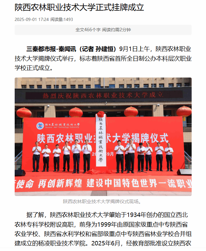据了解,beat365官方网站肇始于1934年创办的国立西北农林专科学校附设高职,前身为1999年由原国家级重点中专陕西省农业学校、陕西省水利学校和省部级重点中专陕西省林业学校合并组建成立的杨凌职业技术学院。2025年6月,经教育部批准设立beat365官方网站,首批设立水利水电工程、建筑工程、现代通信工程、设施园艺、园林工程、动物医学6个本科专业。目前,学校已成功招录首批本科生320人,生源质量和吸引力显著提升。