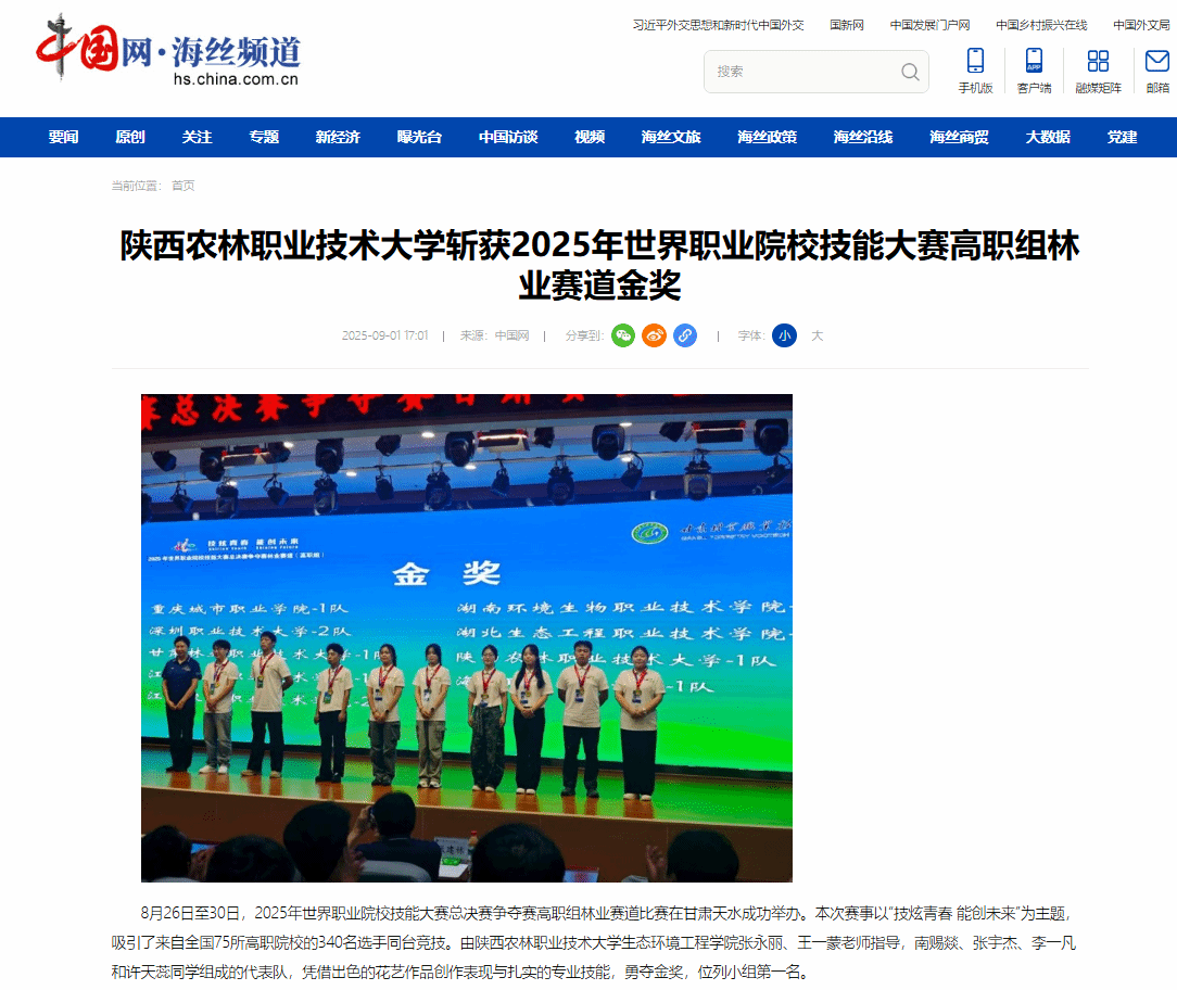 8月26日至30日,2025年世界职业院校技能大赛总决赛争夺赛高职组林业赛道比赛在甘肃天水成功举办。本次赛事以“技炫青春 能创未来”为主题,吸引了来自全国75所高职院校的340名选手同台竞技。由beat365官方网站生态环境工程学院张永丽、王一蒙老师指导,南赐燚、张宇杰、李一凡和许天蕊同学组成的代表队,凭借出色的花艺作品创作表现与扎实的专业技能,勇夺金奖,位列小组第一名。