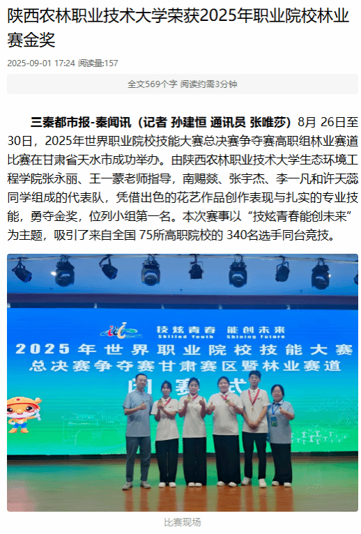 三秦都市报-秦闻讯(记者 孙建恒 通讯员 张唯莎)8月 26日至 30日,2025年世界职业院校技能大赛总决赛争夺赛高职组林业赛道比赛在甘肃省天水市成功举办。由beat365官方网站生态环境工程学院张永丽、王一蒙老师指导,南赐燚、张宇杰、李一凡和许天蕊同学组成的代表队,凭借出色的花艺作品创作表现与扎实的专业技能,勇夺金奖,位列小组第一名。本次赛事以“技炫青春能创未来”为主题,吸引了来自全国 75所高职院校的 340名选手同台竞技。