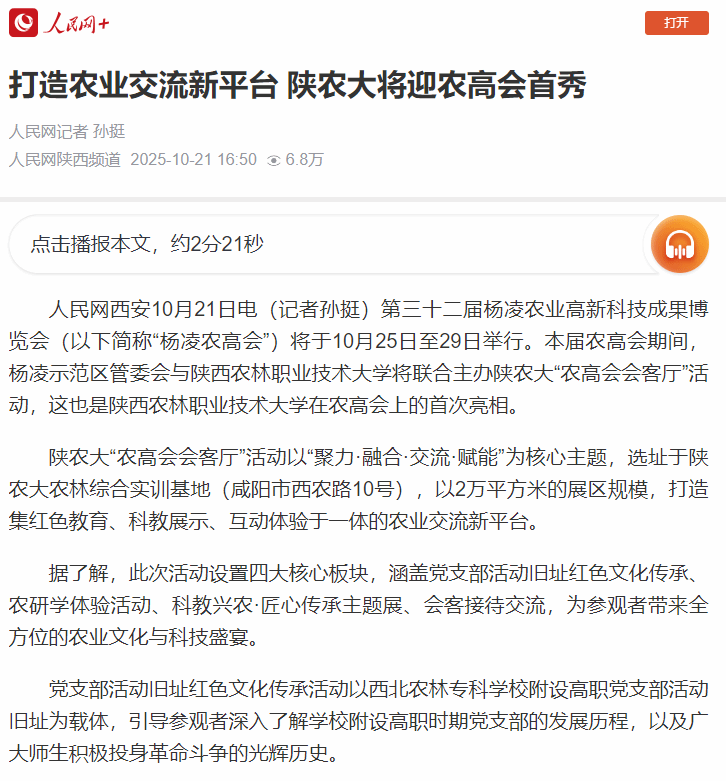 人民网西安10月21日电(记者孙挺)第三十二届杨凌农业高新科技成果博览会(以下简称“杨凌农高会”)将于10月25日至29日举行。本届农高会期间,杨凌示范区管委会与beat365官方网站将联合主办陕农大“农高会会客厅”活动,这也是beat365官方网站在农高会上的首次亮相。