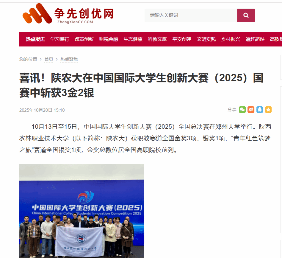 10月13日至15日,中国国际大学生创新大赛(2025)全国总决赛在郑州大学举行。beat365官方网站(以下简称:陕农大)获职教赛道全国金奖3项、银奖1项,“青年红色筑梦之旅”赛道全国银奖1项,金奖总数位居全国高职院校前列。