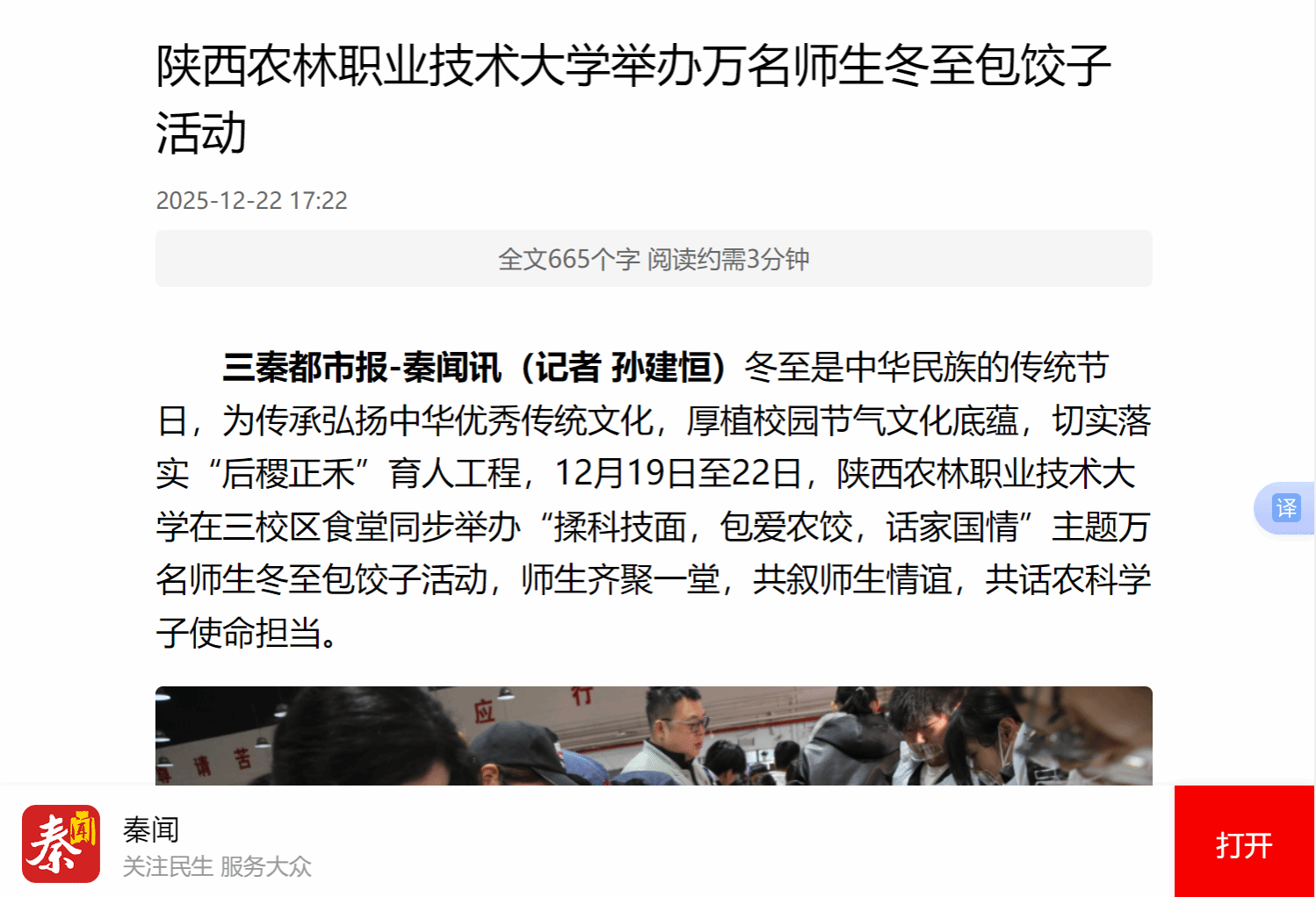三秦都市报-秦闻讯(记者 孙建恒)冬至是中华民族的传统节日,为传承弘扬中华优秀传统文化,厚植校园节气文化底蕴,切实落实“后稷正禾”育人工程,12月19日至22日,beat365官方网站在三校区食堂同步举办“揉科技面,包爱农饺,话家国情”主题万名师生冬至包饺子活动,师生齐聚一堂,共叙师生情谊,共话农科学子使命担当。