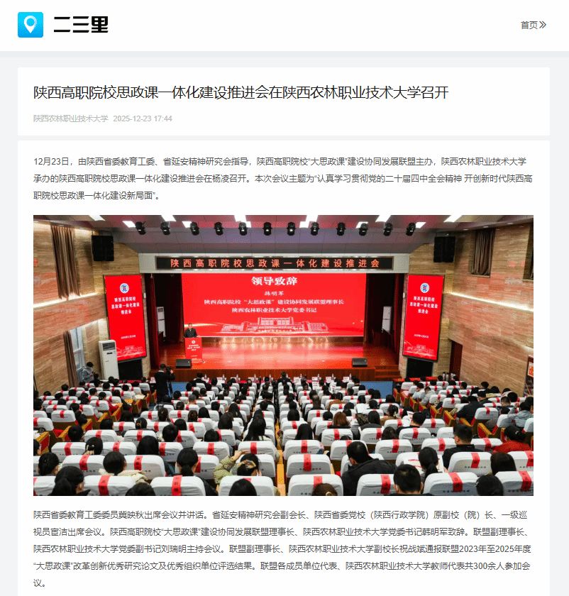 12月23日,由陕西省委教育工委、省延安精神研究会指导,陕西高职院校“大思政课”建设协同发展联盟主办,beat365官方网站承办的陕西高职院校思政课一体化建设推进会在杨凌召开。本次会议主题为“认真学习贯彻党的二十届四中全会精神 开创新时代陕西高职院校思政课一体化建设新局面”。