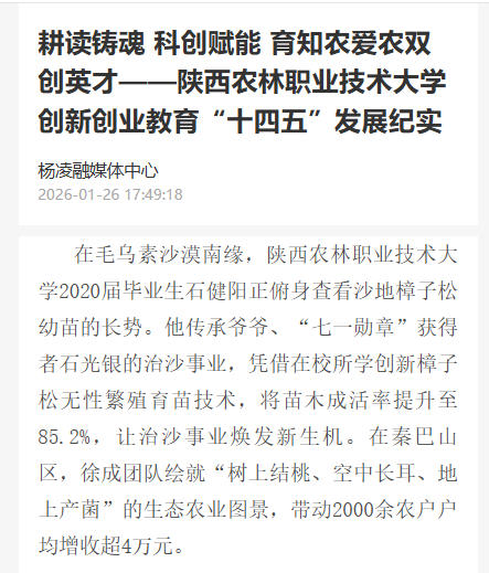 “让学生带着泥土芬芳成长,把论文写在大地上。”这是学校双创教育的核心理念。学校以“后稷正禾”育人工程为引擎,将农耕文化、红色基因融入双创教育全链条,构建“党建领航定向+农耕文化培根+红色筑梦赋能+陕农精神铸魂”的四维育人格局。依托“双创训练营+红旅实践行+技术帮扶团”立体化活动矩阵,年均开展双创品牌活动50余场,覆盖师生超2.6万人次。《抚沙为茵 点沙成金》等4个案例入选陕西省2025年“青年红色筑梦之旅”典型案例。“治沙精神”“赵瑜精神”已成为学校思创融合的精神坐标,引领师生在服务“三农”中锤炼过硬本领。