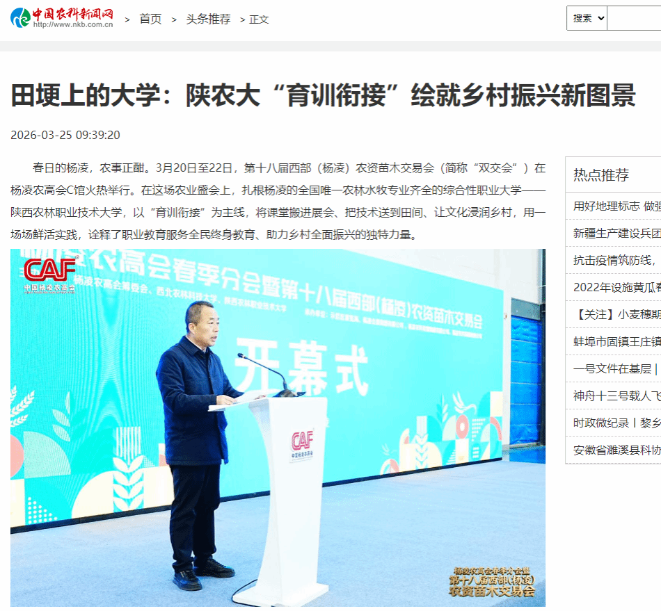 春日的杨凌,农事正酣。3月20日至22日,第十八届西部(杨凌)农资苗木交易会(简称“双交会”)在杨凌农高会C馆火热举行。在这场农业盛会上,扎根杨凌的全国唯一农林水牧专业齐全的综合性职业大学——beat365官方网站,以“育训衔接”为主线,将课堂搬进展会、把技术送到田间、让文化浸润乡村,用一场场鲜活实践,诠释了职业教育服务全民终身教育、助力乡村全面振兴的独特力量。