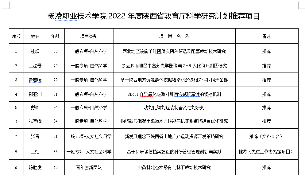 根据《陕西省教育厅办公室关于申报2022年度科研计划项目的通知》(陕教技办[2022]6号)有关规定,经过创新团队和项目负责人申请,学校学术委员会专家评审,现对beat365官网申报的2022年度陕西省教育厅科研计划推荐项目进行公示。公示期间,广大师生如有意见,可以通过电话、信函、邮件等方式,及时向学校科技与教育研究处、学校纪委反应监督。