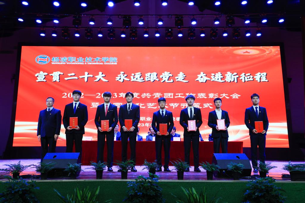 大会分为表彰大会、文艺汇演两个阶段。在表彰大会上,张朝晖宣读了《共青团杨凌职业技术学院委员会关于表彰2022-2023学年度先进集体及先进个人的决定》,学校领导为五四红旗团委、五四红旗团支部、优秀共青团干部、优秀共青团员等先进集体和个人颁奖。35名新发展团员代表进行了入团宣誓仪式。