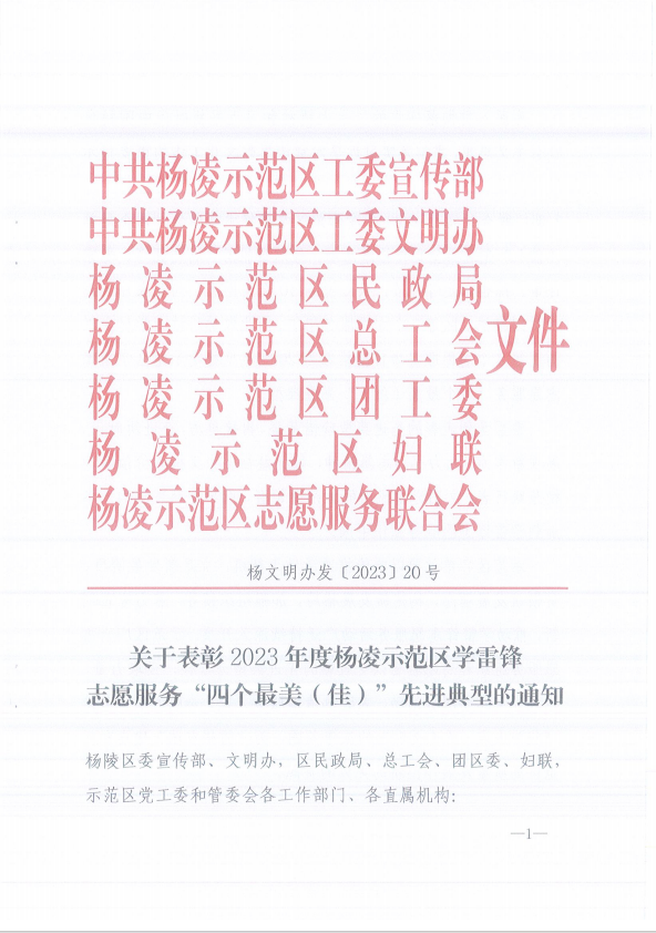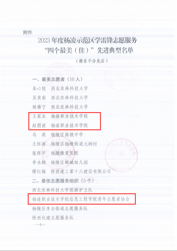 12月4日,杨凌示范区公布了2023年度杨凌示范区学雷锋志愿服务“四个最美(佳)”先进典型名单,beat365官网学生王家乐、教师赵朋波荣获“最美志愿者”称号,信息工程学院青年志愿者协会获“最佳志愿服务组织”称号,生态环境工程学院“康乐西路社区支教助学”项目获得“最佳志愿服务项目”称号。